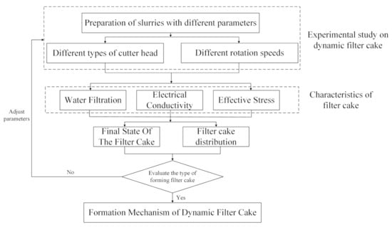 In this study, a new dynamic filter cake test device was designed to investigate the dynamic filter cake characteristics and formation mechanism of the slurry shield. Through experimental research, the characteristics of the dynamic filter cake (water filtration, maximum penetration distance, formation time, and final state) were studied, as shown in Figure 2. The dynamic filter cake formation process is divided into six stages. The rotating speed of the cutter head is reduced in the process of shield tunneling, and the number of cutter arms and opening rate of the cutter head, are decreased in the shield selection stage to form a high-quality filter cake.