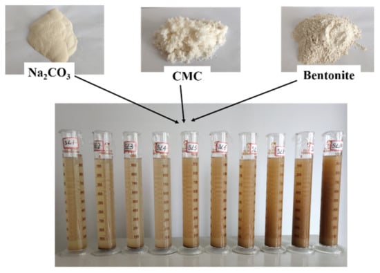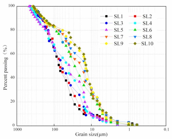 In this test, clay from the middle and lower reaches of the Yangtze River was selected and immersed to make the base slurry. Referring to the slurry parameters commonly used in slurry shields, it was made with a bentonite to water ratio of 1:12 [,]. The mixture included bentonite, CMC (carboxymethyl cellulose), and Na2CO3 (sodium carbonate) in certain proportions and had a hydration time of about 24 h. As the main pulping material, bentonite has good water absorption, expansibility, and cohesiveness. CMC was used as the tackifier of the slurry, and Na2CO3 played roles in dispersion and uniformity in the slurry. To reduce the test error and ensure test repeatability and comparability among data, 10 groups of slurry (SL1–SL10) were tested, as shown in Figure 3. In physical shield tunneling, the values of slurry density and viscosity are strictly controlled within certain ranges. The density of the slurry shield should be 1.05–1.30 g/cm3, and the viscosity should be 20–35 s. Thus, as shown in Table 1, the physical–mechanical parameters of the test slurry were selected. The properties of the slurry samples were measured in the laboratory. Specifically, a 1002 type slurry-specific gravity scale and a Russian funnel viscometer were used to measure the slurry’s density and viscosity. The relative density error was within 0.01 g/cm3, the error in the slurry viscosity was within ±1 s, the 10 groups of slurry samples had good physical stability, and the 2 h bleeding rate was less than 2%. The grain size distribution of the 10 groups of slurry measured by the MS2000 laser particle size analyzer is shown in Figure 4.