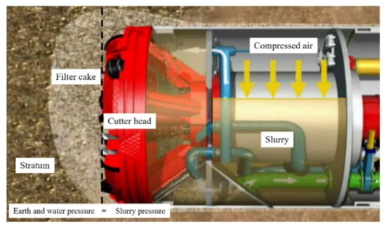 In highly permeable stratum, the underwater environment is complex [,,]. The timely formation of a safe and effective filter cake is the key to guaranteeing the stability of the excavation face in slurry balance shield tunnels and reducing the project risks [,,]. Through designing the slurry filtration column test, Fritz [] confirmed that the addition of certain proportions of bentonite, polymer, sand, and vermiculite could improve the stability of the excavation face for the high-permeability stratum (the maximum permeability value is 10−3 m/s). Zdenek et al. [] investigated the pressure transfer mechanism interaction with cutting tools for the transfer of pressure in areas of deep penetration exceeding the cutting tool depth. They proposed that a linear pore pressure distribution can deliver more efficient support pressure transfer due to the lower slurry penetration depth with increased stagnation. Min et al. [] used a self-made slurry filtration device to investigate filter cake formation under conditions with different slurry characteristics and stratum combinations and categorized the slurry particle accumulating form into three types, as shown in Figure 1: an intact filter cake, filter cake plus a permeation, and an infiltration zone without a filter cake.