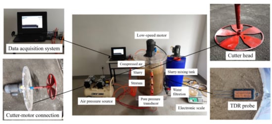The filter cake formation process is complicated. The slurry proportion, slurry pressure, stratum conditions, cutter head structure, rotation speed, and cutter layout all affect the penetration process and the filter cake quality. However, previous studies all focused on the static filter cake, ignoring the effects of periodic cutting and slurry pressure fluctuation on the surrounding soil, as well as the dynamic filter cake formation process [,,,]. Therefore, a self-made test apparatus was developed to establish a dynamic infiltration model in the saturated sand stratum. The features of this apparatus are as follows: Dynamic filter cake experiments of the slurry shield can be carried out. A replaceable cutter head type experiment apparatus can be designed. As the cutter head of the shield machine used in each shield tunnel is designed uniquely, the apparatus can be used for relevant experiments for each shield machine by making and replacing the experiment cutter head. By applying TDR equipment (TDR is a time-domain reflection technique that can measure the conductivity of soil), the slurry penetration distance can be tracked more accurately through the change in soil conductivity. It is an experimental apparatus system that can be used for future shield machine selection. The apparatus can also be used for filter cake-formation experiments in the cutter head-selection stage, and the characteristics of the cutter head can be selected from the perspective of filter cake formation, including the number of cutter arms, opening rate, and other key parameters.
