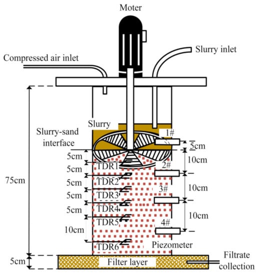 The previously developed device can only simulate the static filter cake [,,,]. This was based on the slurry infiltration principle of the slurry shield machine, the balance between compressed air, slurry in the slurry chamber, and the water and earth pressure, as shown in Figure 5. A dynamic filter cake test system, as shown in Figure 6, was independently developed. The slurry chamber and cutter head of the slurry shield machine are key components in the simulation of dynamic filter cake formation. This apparatus reflects the interaction between the slurry chamber, cutter head, and stratum of the physical shield machine well. The test system consists of a slurry filtration column, slurry mixing tank, air pressure source, connecting shaft, motor and cutter head, controller, and measuring devices. The top of the filtration column is fixed with a specific low-speed motor. The motor is equipped with a cutter head governor to adjust the rotation speed and direction, and the speed range is 0–9 rpm with an accuracy level of 0.1 rpm. The dimensions of the test apparatus and measurement devices are shown in Figure 7.