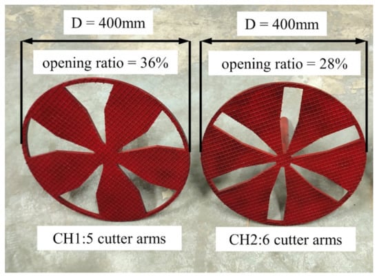 The filtration column has a height of 80 cm and an outer diameter of 42 cm. Time-domain reflectometries (TDR) were placed in 6 holes on the sidewall to measure the electrical conductivity after the penetration of the stratum by slurry so as to determine the penetration distance and diffusion scope of the slurry under the influence of the cutter head’s rotation. The conductivity range of the TDR is 0–20,000 μs/cm, and the accuracy level is ±3%. Simultaneously, 4 vibrating wire-type pore pressure transducers were installed on the other sidewall to measure the slurry pressure and pore pressure in the filtration column. The measurable range is 0˜600 Kpa, and the accuracy is 1.0 Kpa. Cutter heads with a large opening rate are widely selected during slurry shield tunneling in underwater sandy soil [,]. Two types of cutter head were designed in this test, as shown in Figure 8. The CH1 type is characterized by 5 cutter arms with an opening rate of 36%, and the CH2 type is characterized by 6 cutter arms with an opening rate of 28%. The outer diameter of the cutter head (400 mm) is made of alloy steel and has a thickness of 15 mm. In addition, the upper part of the cutter is covered with a large number of grid-like alloys.