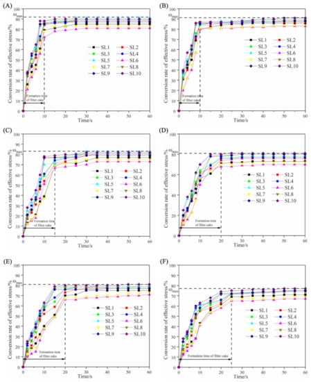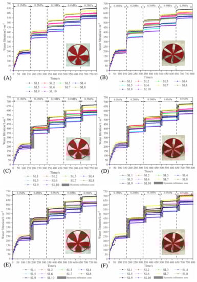 In the slurry permeation test, the water filtration volume at a certain time can reflect the quality of the filter cake: the less water filtration, the better the quality of the filter cake and the greater the stability of the excavation face [,]. The water filtration time curves considering the effects of the cutter head structure and rotation are shown in Figure 9. We found that the SL1–SL10 slurry sample curves had a stepped frame distribution with the two cutter head types and three different speeds; that is, the permeation speed increased rapidly and then gradually decreased within 10 s for each loading pressure when the cutter head stopped. As shown in Figure 9A,B, as the slurry pressure increased, the slurry particles penetrated into the soil to form a filter cake, and the stress was transmitted to the soil particles through the filter cake.