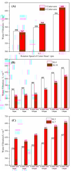 The cutter head structure (the number of cutter arms and opening ratio) and rotation speed were found to have essential impacts on the volume of water filtration. The final water filtration volume produced with different cutter heads and rotation speeds for the SL5 slurry sample (SL5 slurry is also selected as the final state) is shown in Figure 10A. When the cutter head stopped, the differences in the water filtration volume were minute. As the cyclic damage to soil and filter cake increased with the cutter head speed, the final water filtration volume continued to increase. When the cutter head rotated, the water filtration volume of the 6-cutter arm was more than that of the 5-cutter arm. The more cutter arms there were, the greater the soil destruction was, increasing water filtration and reducing the quality of the filter cake.