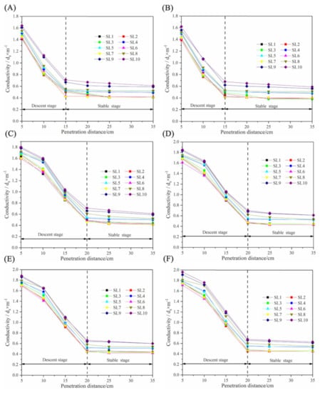 Variation curves of electric conductivity: (A) cutter head CH1, rotation speed of cutter head = 0 rpm, (B) cutter head CH2, rotation speed of cutter head = 0 rpm, (C) cutter head CH1, rotation speed of cutter head = 0.5 rpm, (D) cutter head CH2, rotation speed of cutter head = 0.5 rpm, (E) cutter head CH1, rotation speed of cutter head = 1.0 rpm, (F) cutter head CH2, rotation speed of cutter head = 1.0 rpm.