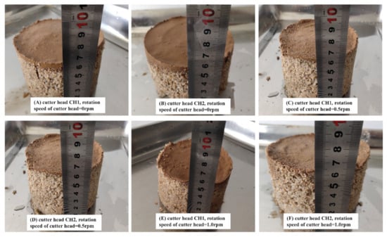 As shown in Figure 13, when the cutter head stopped or rotated, a ‘filter cake plus an infiltration zone’ was formed with a clear boundary between the accumulation layer of the slurry particles and the stratum. As shown in Figure 13A,B, it is evident that when the CH1 and CH2 cutter heads stopped, the thickness of the filter cake was consistent—about 8 mm. As shown in Figure 13C–F, as the rotation speed increased continuously, the shapes of filter cakes constructed with two types of cutter head gradually transited from ‘filter cake plus a permeation zone’ to ‘a permeation zone without filter cake’, and the thickness of the filter cakes decreased gradually. Specifically, when the rotation speed increased to 0.5 rpm, the surface of the filter cake formed by the 5-cutter arm was smoother with a thickness of about 4 mm, while the 6-cutter arm cutter head formed a rougher filter cake surface with a thickness of about 3 mm, because the more cutter arms there were, the more times the stratum was cut within a certain time period and the thinner the filter cake became. As shown in Figure 13E,F, as the rotation speed increased, the thickness of the filter cake continued to decrease. The thicknesses of the filter cakes generated by the 5-cutter and 6-cutter arm were about 3 and 1 mm, respectively, because, under the combined functions of the cutter head cutting, slurry permeation, and air pressure, sand particles on the stratum surface were redistributed. The rotation of the cutter head destroyed the structure of the sand at the surface of the stratum, the thickness of the filter cake was thin, and the slurry particles completely penetrated the stratum pores. Based on the characteristics of the formed filter cake, it appears that the fewer cutter arms there were, the lower the permeability of the slurry film was, and the slower the speed of the cutter head was, making the set up more conducive to maintaining the stability of the shield excavation face.