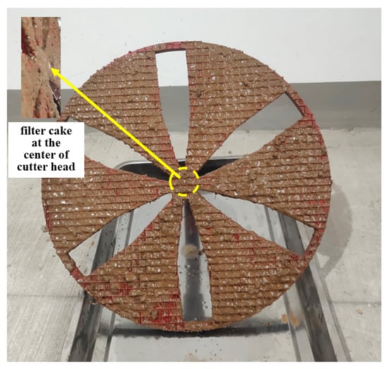 As shown in Figure 14, the cutter head was removed after the test. By observing the filter cake on the cutter head, a thin filter cake attached to the surface of the cutter head was identified. This occurred because the mixture of slurry and bentonite particles has a certain viscosity. This filter cake can be considered to be firmly adhered to the cutter head and is not affected by the cutting of the cutter head. The filter cake attached to the center of the cutter head was found to be thicker than that at other sites, as the center of the cutter head is relatively static relative to the soil, meaning there is less damage to the formed filter cake, and the filter cake formed at the center of the cutter head is more compact. While the filter cake at the edge of the cutter head is relatively thin due to the high linear speed, when the edge rotates, this greatly disturbs the formed filter cake.