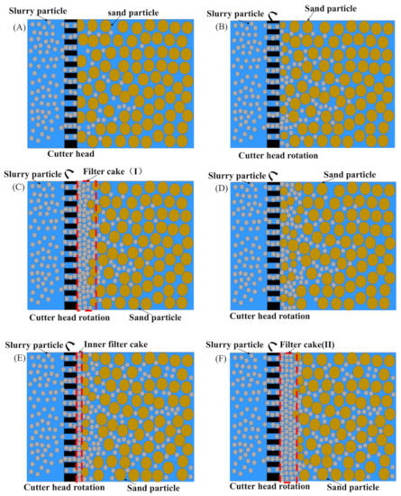 Stage Ⅳ: The cutter head rotated, and the newly formed filter cake structure was destroyed. Meanwhile, as the cutter head cut the sand particles, the structure of the sand was further destroyed, and the slurry particles in the stratum surface were mixed with sand particles, as shown in Figure 16D.