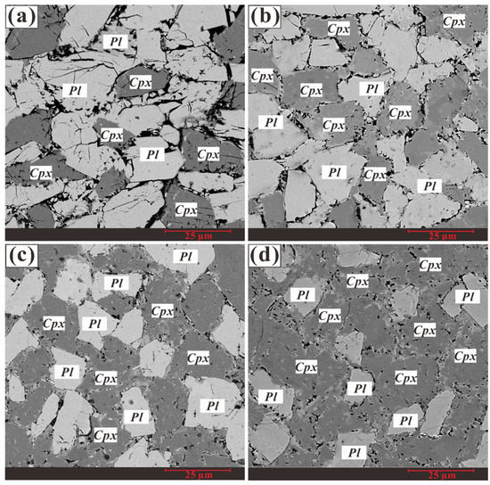 Four representative backscattered electron images of dry hot-pressed sintering gabbro by using scanning electron microscope with different mineralogical proportions: (a) Cpx20Pl80, (b) Cpx40Pl60, (c) Cpx60Pl40, and (d) Cpx80Pl20. Cpx and Pl represent clinopyroxene and plagioclase, respectively.