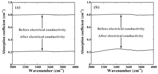 FT-IR spectra in the dry hot-pressed sintering gabbro before and after electrical conductivity measurements within the wavenumber range of 3000–4000 cm−1. Here, (a,b) represent the clinopyroxene and plagioclase in the dry hot-pressed sintering gabbro, respectively.