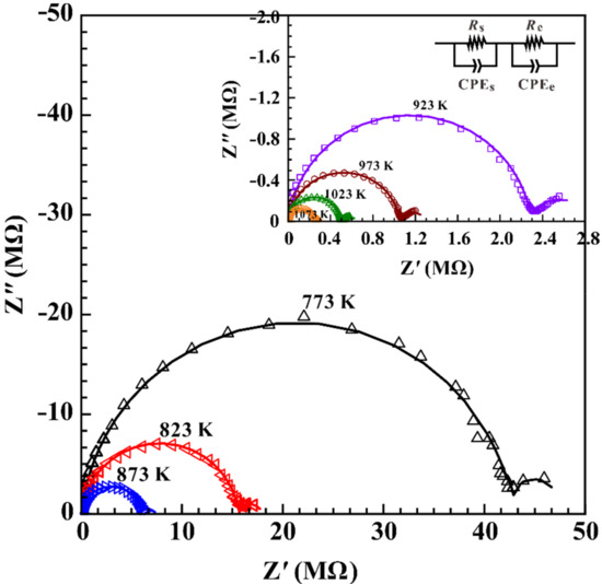 Typical complex impedance spectra of hot-pressed sintering gabbro (Cpx50Pl50) at temperature ranges of 773–1073 K and pressure of 1.0 GPa are shown in Figure 4. The impedance spectra arcs were composed of an ideal semicircular arc within the high-frequency range from 106 Hz to ~1 Hz and another extra small tail at the frequency range from ~1 Hz to 10−1 Hz, which reflected the electrical transport process of grain interior and polarization effect at the sample–electrode interface, respectively [24]. Therefore, the equivalent circuit composed of the series connection of RS-CPES (RS and CPES represent the resistance and the constant phase element from the grain interior, respectively) and RE-CPEE (RE and CPEE represent the resistance and the constant phase element from the polarization effect at the sample–electrode interface, respectively) were adopted to fit the impedance spectra arc and acquire the conductivity results.