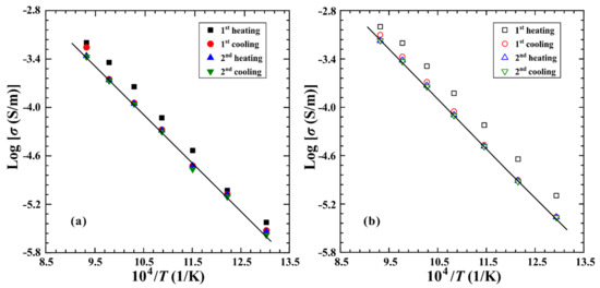 The electrical conductivities of the hot-pressed sintering gabbro among two heating–cooling cycles at a pressure of 1.0 GPa. Here, (a,b) represent the samples of Cpx30Pl70 and Cpx70Pl30, respectively.