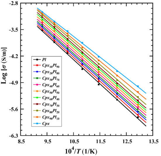 Gabbro, as a representative basic intrusive rock, is mainly composed of clinopyroxene and plagioclase. There are significant differences in the mineralogical proportion of gabbro which are outcropped in different regions of oceanic crust and craton crust [5,6,34,35]. Therefore, electrical conductivities of hot-pressed sintering gabbro with various mineralogical proportions (CpxXPl100−X, X = 0, 10, 20, 30, 40, 50, 60, 70, 80, 90 and 100 vol%) were systemically investigated under conditions of temperature ranges from 773 K to 1073 K and 1.0 GPa, which were also compared with the available previously reported results on natural gabbro (Figure 10).