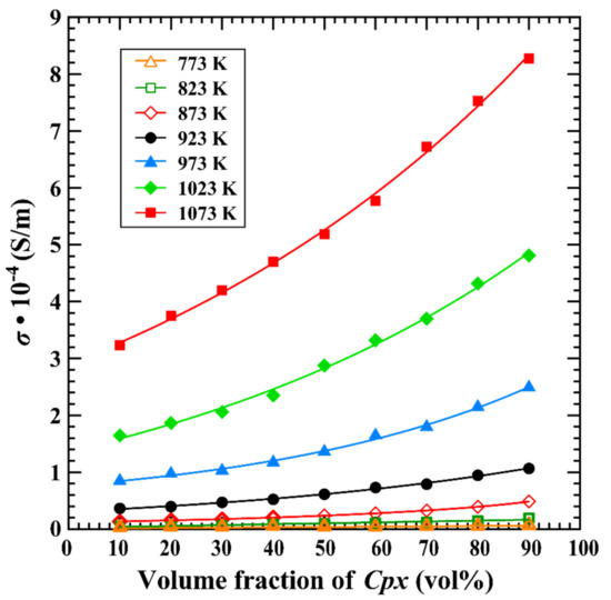 As for each temperature point, a detailed dependence of the electrical conductivity of hot-pressed sintering gabbro on the volume percentage of clinopyroxene was illustrated in Figure 8. It is clear that the electrical conductivity of hot-pressed sintering gabbro shows a strong dependence on the variation of the volume percentage of clinopyroxene, i.e., electrical conductivity of the sample increases with the rise of the volume percentage of clinopyroxene at a constant temperature condition. At the same mineralogical proportion, the electrical conductivity of dry gabbro gradually increases with the rise of the temperature. Noteworthily, the dependence relation of electrical conductivity of gabbro on the variation of volume percentage of clinopyroxene tends to strengthen when the measured temperature is enhanced from 773 K to 1073 K. As one example at the fixed temperature of 1073 K, when the volume percentage of clinopyroxene is increased from 10% to 90%, the electrical conductivity of hot-pressed sintering gabbro is enhanced from about 3.23 × 10−4 S/m to 8.27 × 10−4 S/m accordingly.