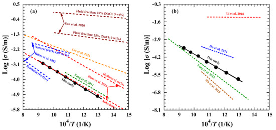 Comparisons of the electrical conductivities of dry clinopyroxene (a) and dry plagioclase (b) at temperatures of 773–1073 K and 1.0 GPa in present studies with previous results, respectively. The electrical conductivity data for clinopyroxene are from Yang et al. (2011) [11], Zhao et al. (2016) [12] Hinze et al. (1981) [13], Liu et al. (2021) [14] and Sun et al. (2020) [15]. The electrical conductivity data for feldspar are from Yang et al. (2012) [16], Hu et al. (2011, 2015) [17,18], Li et al. (2020) [31].