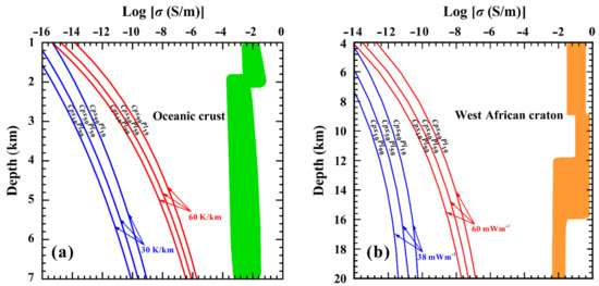 where T0 is the surface temperature (K), Q is the surface heat flow (mW/m2), Z is the lithosphere layer depth (km), k is thermal conductivity (Wm/K) and A0 is the lithospheric radiogenic heat productivity (μW/m3). According to the heat conduction equation and thermal calculation parameters, the electrical conductivity–temperature results can be converted to an electrical conductivity–depth profile [25,43,44]. To simplify the conductivity–depth profile model, some necessary assumptions and extrapolations are proposed as follows: (1) the influence of pressure on the electrical conductivity of anhydrous gabbro is ignored; (2) a Ni–NiO solid buffer is adopted to represent the oxygen fugacity in the regions of oceanic crust and craton crust; (3) in the present studies, the hot-pressed sintering gabbro is anhydrous, the effect of water content on the electrical conductivity of sample does not need to be considered; (4) all of the other potentially influential characteristics, including grain size and grain boundary state, on the electrical conductivity of rock can be neglected; (5) the influence of accessory minerals and high conductive phases on the electrical conductivity of gabbro are ignored; (6) dry hot-pressed sintering gabbro with three typical mineralogical proportions (Cpx10Pl90, Cpx50Pl50, and Cpx90Pl10) are adopted to represent the chemical composition of gabbro-rich regions in the oceanic crust and craton crust.