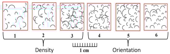 Graphical scheme used for the description of the density and orientation of surface marks 1 = <50 cm−2, 2 = 50 to 100 cm−2, 3 = >100 cm−2, 4 = isotropic, 5 = intermediate, 6 = oriented.