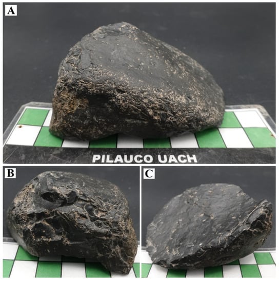 Hundreds of obsidian clasts were collected in 2005 by MP from a large secondary obsidian deposit located along the southern shore of Laguna Blanca on the eastern slope of the Jarellón volcanic caldera, near the Chilean–Bolivian border [43] (Figure 1). The obsidian clasts had previously been described [44] as “small- to medium-sized, translucent black to reddish-brown, rounded pebbles from a secondary source and redeposited on the shores of a lake”. The obsidian was heterogeneously distributed with variable densities between 500 and 1000 nodules m−2, producing a uniform layer with soil development. Measured concentrations of incompatible elements such as Ba, Cs, Hf, Rb, Sr and Zr indicate that the samples correspond to alkaline or calcoalkaline obsidian [43,45].