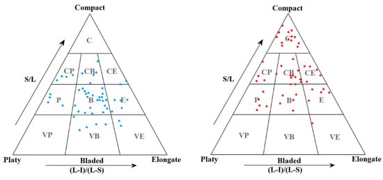 Clast shape classification diagram [27]. On the left, the light blue dots correspond to naturally shaped samples, and the red dots on the right represent artificially fractured samples. After breakage, the shapes became more compact.