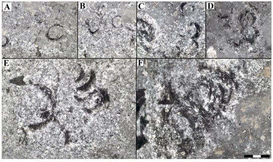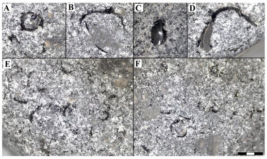 Figure 7. Different types of percussion marks generated in the experiment for the rounded samples: (A) circular, (B) crescent, (C) pseudo-circular, (D–F) crescent. The bottom right bar measures a total of 3 mm, the same from (A–F).