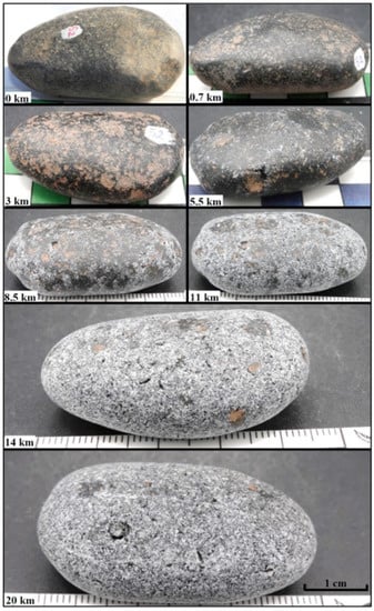- Attal, M.; Lavé, J. Pebble abrasion during fluvial transport: Experimental results and implications for the evolution of the sediment load along rivers. J. Geophys. Res. Earth Surf. 2009, 114. [Google Scholar] [CrossRef]