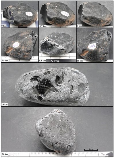 With respect to the density of the surface marks, Table 3 shows the maximum numbers achieved. The highest density was obtained in naturally shaped samples with a maximum of 70 marks cm−2, a little higher than that observed in the set of fractured pieces (65 marks cm−2), which was reached at the end of the experiment at 20 km of travel. The relationship between transport distance and mark density is statistically significant, because the p-value in the ANOVA table is less than 0.05 with a confidence level of 95.0%. The R-squared statistic indicates that the fitted model explains 97.1% of the variability in marks. The correlation coefficient is equal to 0.986, indicating a relatively strong relationship between the variables. The equation that relates both variables is: