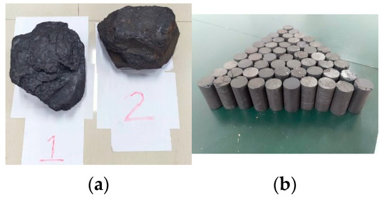 In this study, two coal blocks were taken from the Baode coal mine at a depth of approximately 300 m in Shanxi Province, China. A series of cylindrical samples with a diameter of 25 mm and a length of approximately 50 mm were machined from these two coal blocks, which were prepared following the American Society for Testing and Materials (ASTM D7012-14). After sample processing and molding, the surfaces of both sample ends were carefully polished to a smooth surface, as shown in Figure 1. The average density of samples was approximately 1.49 g/cm3.