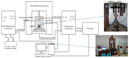 A TFD-2000 microcomputer servo-controlled triaxial rheological testing machine, as shown in Figure 3, was used to test the mechanical properties of the samples, including uniaxial compression and triaxial compression.