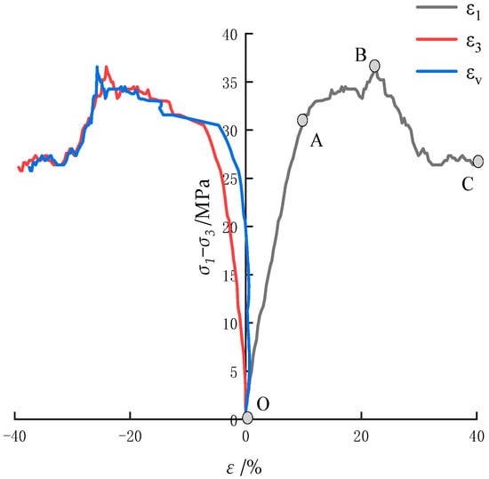 The radial strain (ε3) of the samples almost showed linear elastic growth at the pre-peak stage, and the growth amplitude was small. In the post-peak stage, the radial strain increases rapidly, but when it reaches half of the maximum axial strain, the samples are completely destroyed. The volumetric strains (εv) all show a left-turning trend before approaching the peak, showing an obvious expansion mechanism. In the post-peak stage, the expansion is more obvious.