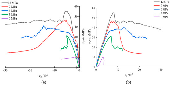 The variation between deviatoric stress and strain of samples with 0° under different confining pressures. (a) radial strain (ε3). (b) axial strain (ε1).