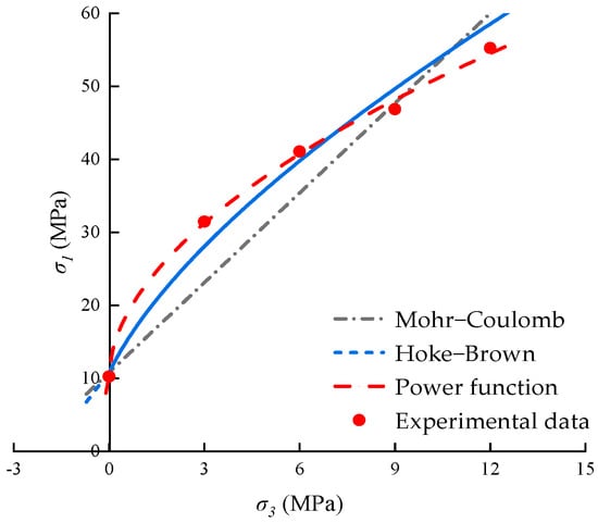 The experimental data under different confining pressures are fitted by the Mohr–Coulomb strength criterion, Hoek–Brown strength criterion and Power function criterion, as shown in Figure 6, which indicates that with the increase in confining pressure, the peak strength of the coal sample increases significantly. There are great differences in the fitting degree of different strength criteria to the experimental data. Therefore, the squared correlation coefficient (R2) is used to represent the fit degree of different strength criteria. When R2 is closer to 1, it means that the fitting degree is higher. The values of R2 for the Mohr–Coulomb, Hoek–Brown and Power function strength criterion are 0.920, 0.989 and 0.999, respectively. Therefore, the Power function strength criterion has the best applicability to coal.