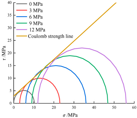 According to the results of the triaxial test, Mohr circles with confining pressures of 0, 3, 6, 9, and 12 MPa, and a Coulomb strength curve are shown in Figure 7. The Coulomb strength curve represents the relationship between the shear stress and the normal stress on the failure. The angle with the σ axis is the internal friction angle φ (36.1°), and the intercept on the τ axis is the cohesive force c (2.9 MPa).