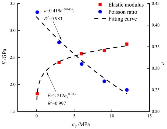 Figure 8 depicts the variation in elastic modulus and Poisson’s ratio (μ) with increases in the confining pressure. In this research, E is calculated by the slope of the stress–strain curve between 0% and 50% of peak strength. As shown in Figure 8, it was found that the sample elastic modulus increases with the increase in the confining pressure and is approximated by a power function relationship, while the Poisson’s ratio decreases exponentially. As exhibited in Figure 8, the Power function is employed to depict the relationship between E and σ3 and the exponential function is used to describe the relationship between μ and σ3. According to the regression analysis, we can obtain the equation as follows: