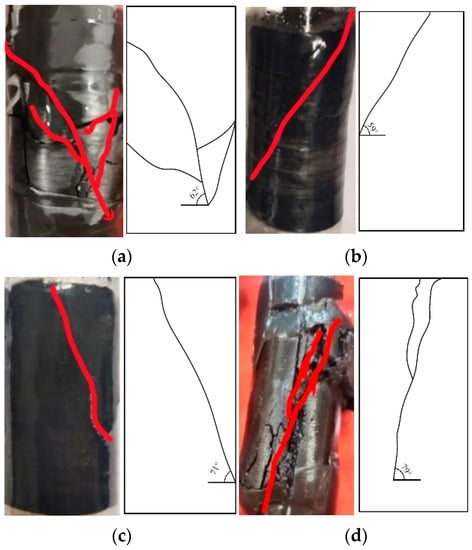 Figure 9 shows the failure samples after triaxial compression tests. The marked angle is the fracture of the coal sample. It was found that the failure patterns mainly represent shear failure and the fracture angles are from 59° to 79°. According to the Coulomb strength criterion, the angle of the fracture surface is estimated to be approximately 58°. There is a deviation between the actual fracture surface angle and the predicted value. The reason for the analysis is that coal has heterogeneous properties and contains random cracks alongside other defects, which may cause the coal sample to deviate along the cracks.