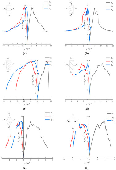 From Figure 10, we can see that samples with a bedding angle have undergone three stages: the linear elastic stage (stage 1), the plastic stage (stage 2) and the residual strength and strain-softening stage (stage 3). Compared with Figure 4, it was found that the pre-peak increasing stage and the post-peak softening stage of coal samples with different bedding angles are quite different, showing great anisotropy. The deviatoric stress–strain curves of the coal samples have obvious stress fluctuations before the peak, except for the coal sample with a 0° bedding angle, showing a transient peak in the middle stage. It is indicated that the coal samples with bedding planes are much more unstable; this phenomenon shows that the bedding plane has a certain influence on the stability of coal. The post-peak softening stages are more complex and diverse. The samples with 45° and 90° bedding angles show brittle failure characteristics and the post-peak stress drops rapidly, as shown in Figure 10c. The samples with other bedding angles show obvious plastic deformation properties after the peak. The post-peak plastic deformation properties are roughly divided into two types. First, the post-peak stress appears in a multiple-level drop state, as shown in Figure 10d–f. Second, the post-peak curve first decreased, then underwent a regional slow rising stage, and finally destabilized and then decreased, as shown in Figure 10a,b. In general, the deformation properties of coal samples are obviously discrete.