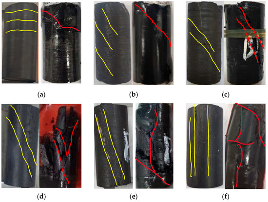 Comparison of coal samples with different bedding angles before and after failure. (a) 0°. (b) 30°. (c) 45°. (d) 60°. (e) 75°. (f) 90°.