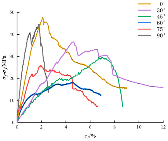 The coal samples were taken from the mine at a depth of approximately 300 m, with an initial stress state of 9 MPa. Therefore, the confining pressure of the triaxial compression test with different bedding angles is 9 MPa. Through the triaxial compression test, the deviatoric stress–strain curves of coal with different bedding angles are shown in Figure 10. The parameters and results of different bedding angle samples are listed in Table 3.