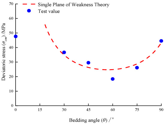 In order to obtain the variation pattern of peak strength and different bedding angles, the single plane of weakness theory based on Coulomb theory was adopted to fit the experimental data, as shown in Figure 13. The fitting function is as follows [25,26]:
