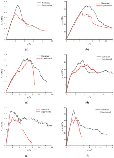Deviatoric stress–strain curves of coal with different bedding angles in the numerical simulation and laboratory test. (a) 0°. (b) 30°. (c) 45°. (d) 60°. (e) 75°. (f) 90°.