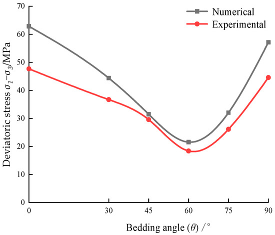 The deviatoric stress–strain curves obtained from the numerical simulation and laboratory test under a confining pressure of 9 MPa are plotted in Figure 14. Comparing the stress–strain curves of the numerical simulation and experimental results, some differences can be found; for example, the stress–strain curves of the numerical simulation have no obvious nonlinear elastic phase in the pre-peak stage. The numerical simulation curve is also not obvious in the softening stage before reaching the stress peak. Analyzing the reasons for these observations, we found that the test sample as a geological material has heterogeneous characteristics due to weak structures such as pores, defects and bedding planes. However, the numerical simulation idealizes the material and quantifies the parameters of the bedding surface, resulting in a certain difference between the numerical simulation curve and the experimental curve. However, by comparing and analyzing the experimental curve and the numerical simulation curve, we find that the general trend of the stress–strain curve is similar, and the position of the stress peak is basically the same, as is the change trend of the elastic modulus. It shows that the microscopic parameters used in the numerical simulation are accurate and reliable, that the model can reflect the mechanical properties of coal with different bedding angles, and at the same time, it can well simulate the deformation process of coal.