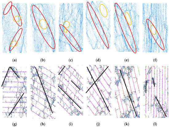 Failure pattern of coal with different bedding angles. (a) Contact force chain of 0°; (b) Contact force chain of 30°; (c) Contact force chain of 45°; (d) Contact force chain of 60°; (e) Contact force chain of 75°; (f) Contact force chain of 90°; (g) Main cracks of 0°; (h) Main cracks of 30°; (i) Main cracks of 45°; (j) Main cracks of 60°; (k) Main cracks of 75°; (l) Main cracks of 90°.