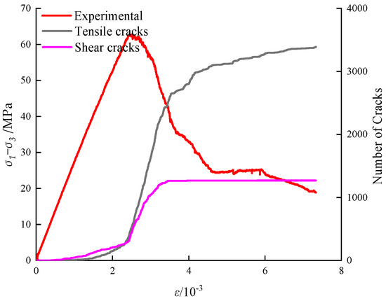 In order to explore the microcrack development pattern, the test curve of the coal sample with a 0° bedding angle is selected for analysis. The evolution of deviatoric stress and shear and tensile microcracks are recorded during loading, as presented in Figure 17. It can be seen that tensile cracks and shear cracks develop simultaneously at the pre-peak stage and the number of shear cracks is larger, resulting in the shear failure of the samples. At the post-peak stage, due to the development of microcracks and the formation of the main shear failure surface, the number of tensile cracks increases exponentially along the failure surface. By monitoring the number of cracks, it is found that the samples underwent shear failure in a macroscopic view, but there is a large number of tensile cracks inside the samples.