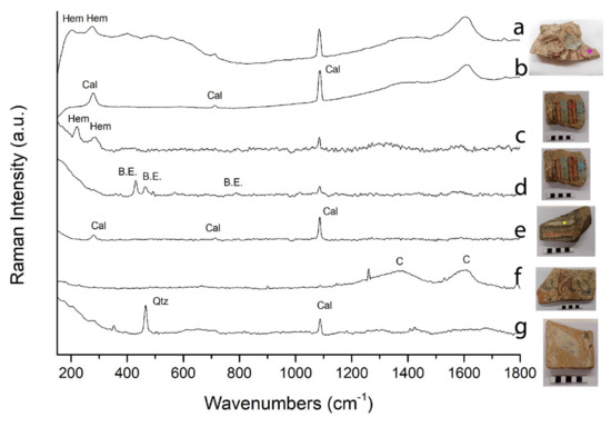 μ-Raman spectra of the Alba Fucens samples and relative peak identification (compound abbreviations: Cal-calcite; Hem-hematite; Qtz-quartz; B.E-Egyptian blue [CaOCuO(SiO2)4]; C-carbon). (a) Pink pigment layer; (b) background of pink pigment; (c) red pigment layer; (d) light blue pigment layer; (e) white pigment layer; (f) black pigment layer; (g) matrix.