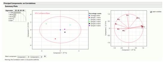 pXRF data (Tables S1 and S2) were easily visualized through principal component analysis (PCA), a multivariate technique that summarizes the information of a dataset by means of a smaller set of “summary indices” emphasizing the differences among data [13]. The intensity of pXRF peaks (X) and the number of samples (N) were arranged in a matrix (N, X). The PCA aims to compress the original hyperspace into a new principal component (PC) space of reduced dimensionality, while retaining as much of the data variation as possible. In general, the PC space contains a total of 2 or 3 principal axes (called score plot) to be easily visualized. A second plot called loadings plot is reported too. The loadings express the magnitude (large or small correlation) and manner (positive or negative correlation) in which the original variables contribute to the scores or PC. In such a plot, high positive correlations are indicated by small angles between vectors, no correlation is indicated by right angles and inverse correlations are indicated by angles close to 180. PCA, ternary diagram, and scatter plot were carried out using algorithms in the JMP Pro software package from SAS Institute [14].