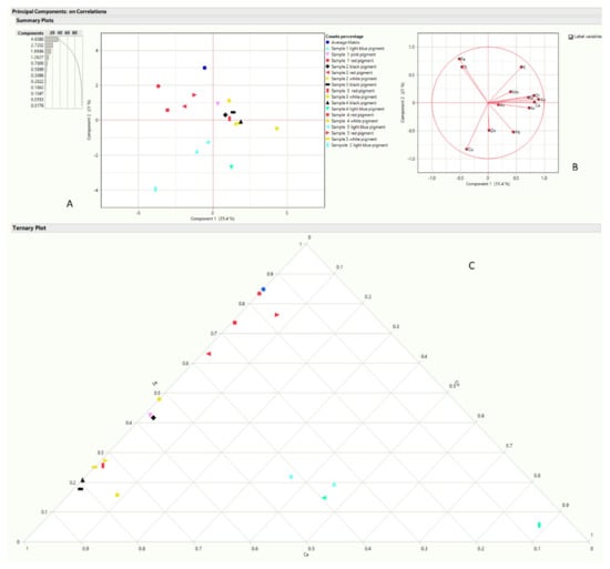 (A,B) Principal Component Analysis plot and (C) ternary diagram of all pigments analyzed with pXRF.