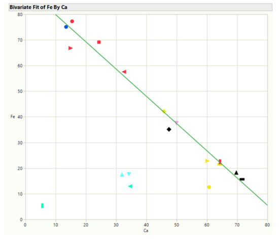 All pigments analyzed in this study, except for light blue, are placed along a straight line in the Fe-Ca plane (Figure 6). Red pigments tend to have an excess of Fe compared to Ca, while in the white and black pigments the Ca becomes predominant at the expense of Fe as expected. Light blue pigment forms a cluster outside the line because of its Cu nature.