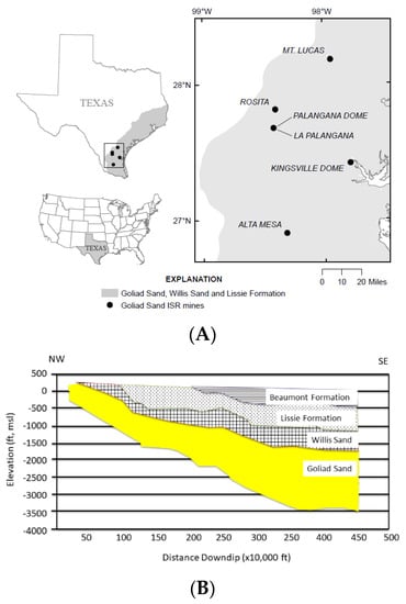 (A) Plan-view map of the Texas Coastal Plain with the six ISR operations completed in the Goliad Sand examined in this study in relation to the state of Texas and the United States region and (B) a cross-section map showing the uranium-rich Goliad Sand (modified from Young and others, 2006 []), indicated by the solid (yellow) shade.