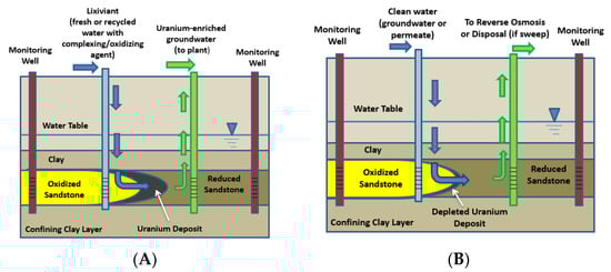 A conceptual model of the (A) production and (B) restoration phases of uranium ISR.