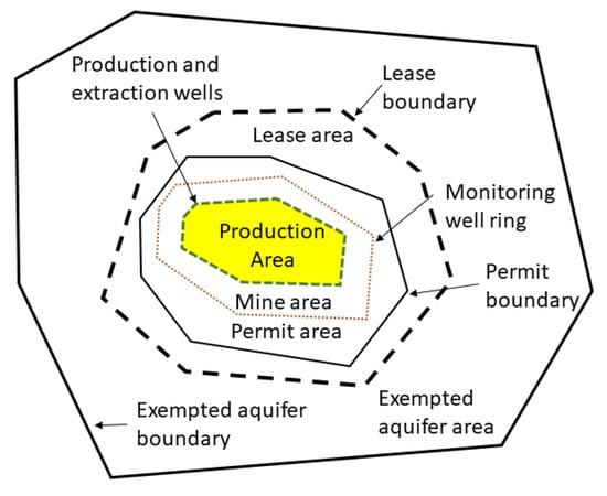 Surface area values related to in-situ recovery (Figure 3) are reported in Mine Permit Applications to the Texas Department of Water Resources or the TCEQ or in the Production Area Authorization (PAA) applications. These areas are described as the lease area, permit area, mine area, production area and aquifer exemption area. The TCEQ defines the mine area by the line drawn through the ring of monitoring wells; the permit area—the area owned or under lease by the permittee, which includes the buffer areas, mine areas and production areas. The lease area is the largest boundary and refers to the acreage leased; the production area is the line drawn around the outer perimeter of all injection and recovery wells used for mining []. In some cases, the records are transient such that the production areas, mine areas, and/or aquifer exemptions change over time, usually due to expansion as new uranium resource discoveries are made or contraction due to scaling back of operations. Thus, each report may not represent the final values for each area.