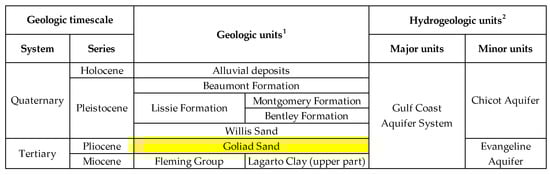 The Goliad Sand consists of poorly consolidated clay, sandstone, marl, caliche, limestone, and conglomerate []. Fluvial deposits within the Goliad Sand consist of very fine to medium sand, gravelly coarse sand, sandy gravel, and pebble-to-cobble-sized gravel [,,]. The Goliad Sand dips towards the coast, ranging in thickness from about 65 m at outcrop to about 670 m near the coast [,]. The Goliad Sand is one of the geologic units that contains the Evangeline Aquifer, which is part of the Gulf Coast Aquifer System located along the Gulf of Mexico coast (Figure 4) []. More details are provided in Baker (1979), Morton et al. (1988), Young et al. (2006, 2010, 2012), Hall et al. (2017), Dahlkamp (2010) and references therein [,,,,,,]. See Figure 4 for the geologic and hydrogeologic units within the area including the Goliad Sand.